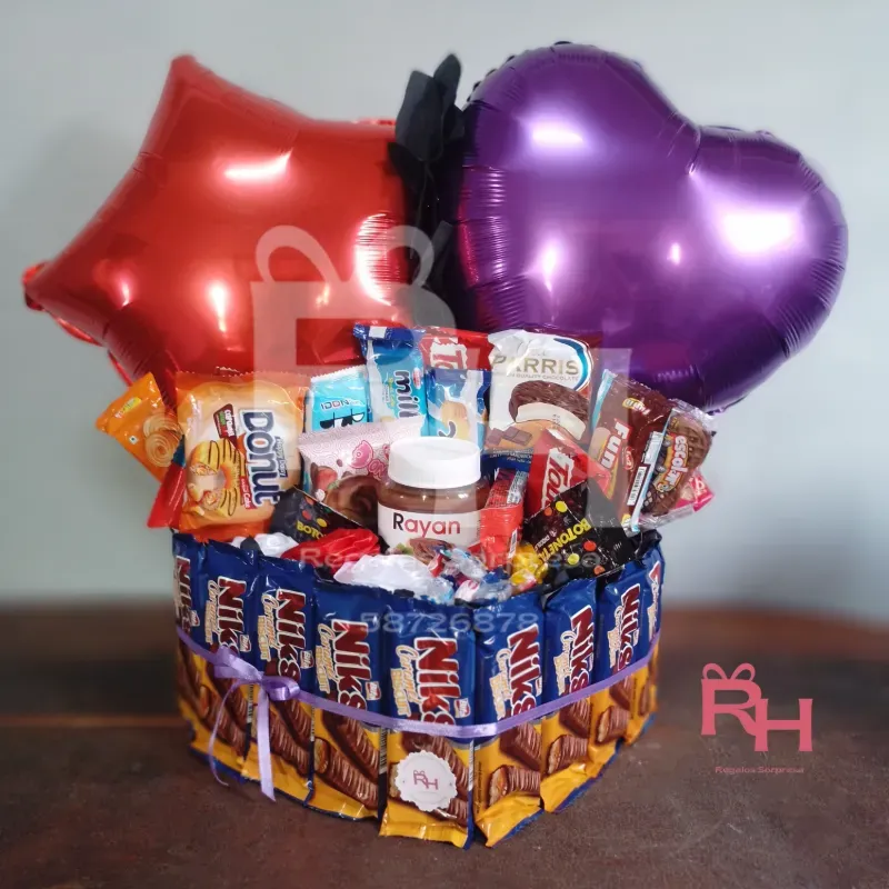 Caja confitera en forma de corazón con 50 confituras, 1 nutella, 10 caramelos, 2 globos de su preferenciay 3 rosas eternas