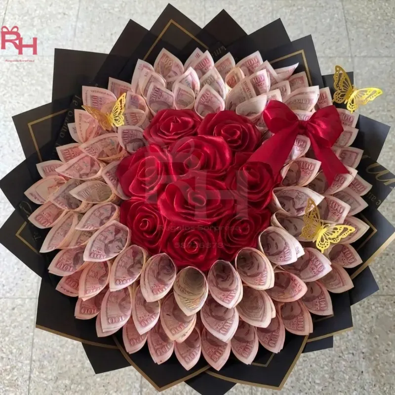 Ramo de 9 rosas eternas del color que desee rodeadas de dinero (la cantidad que desee añadir)