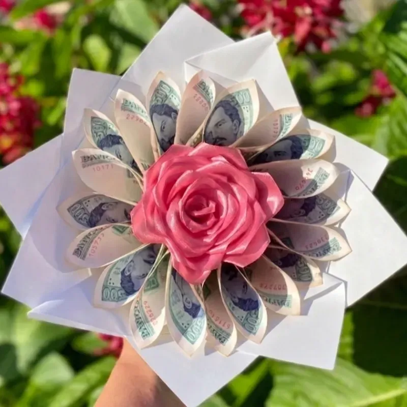 1 rosa eterna del color que desee rodeada de dinero (la cantidad que usted desee añadir)