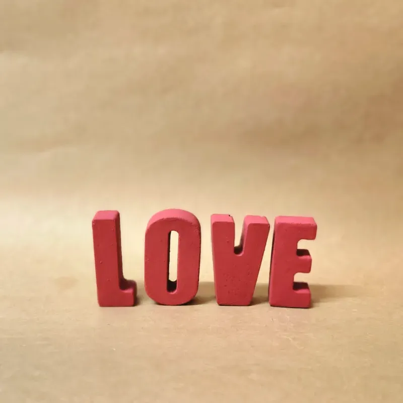 Letras de cemento con la frase LOVE, caben en la palma de la mano y son perfectas para decorar un espacio donde siempre te recuerden a la persona amada.