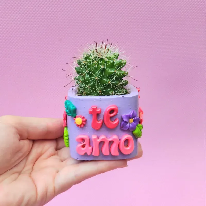 Macetica de cemento decorada con la frase mas bella , contiene un cactus de facil mantenimiento