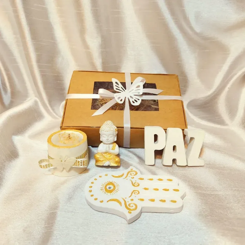 Un regalo unico que consta de Portaincienso de Mano de Fatima , Vela aromatica de vainilla, Letras Decorativas , un pequeño buda y su caja de regalo