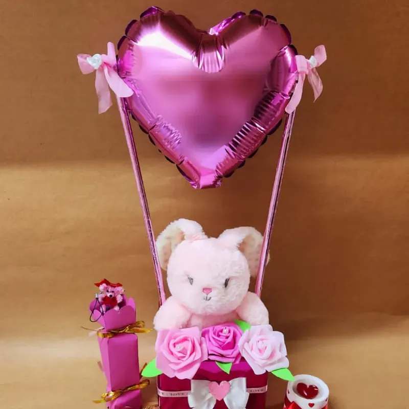 Consta de Peluche , Globo de corazon , Flores decorativas , bombones varios , colgante para el celular , vela aromatica ,y su caja de regalo