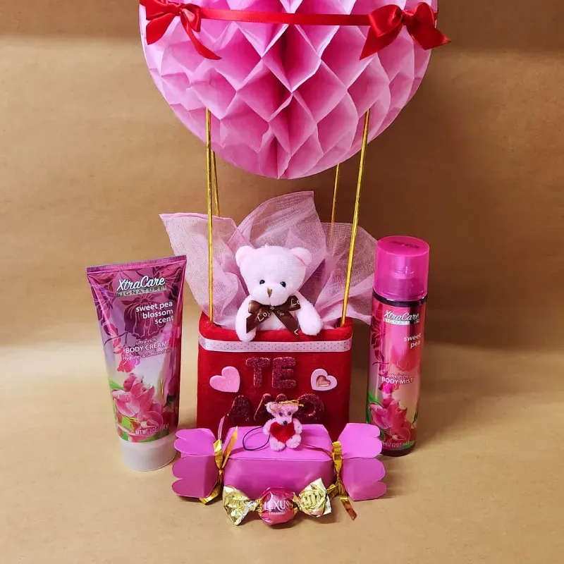 Consta de Conjunto de crema y Colonia, Osito para llavero , Bombones varios , colgante para el