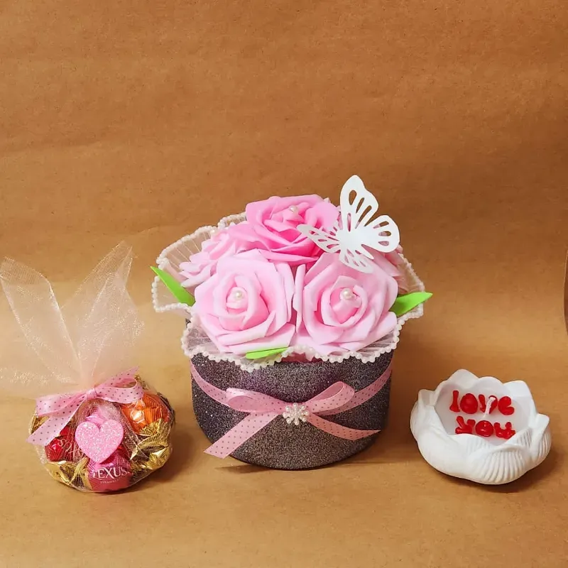 Un regalo que perdura en el tiempo ya que sus rosas son eternas y la cajita se puede usar como organizador , lleva bombones varios y una vela aromatica con olor a chocolate.