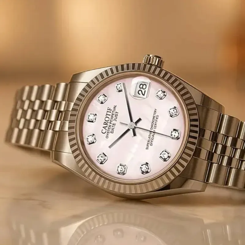 Reloj automatico de mujer Piedras encima Esfera rosa Manilla stalees stick