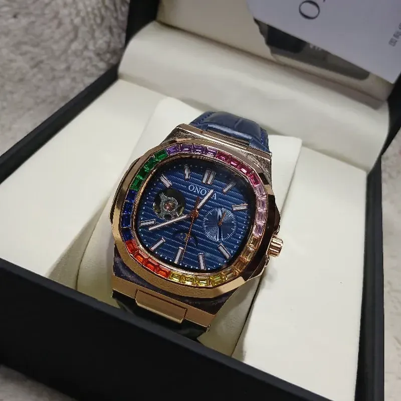 RELOJ AUTOMÁTICO DE MANILLA DE CUERO CON PIEDRA DE COLORES UNA BELLEZA