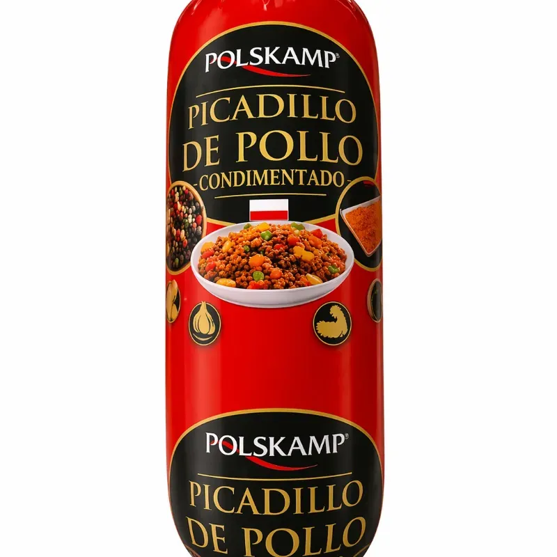 Este producto es picadillo de pollo condimentado de la marca Polskamp. Viene en una presentación de tubo sellado (tipo embutido), que es muy común para mantener la carne procesada fresca y lista para cocinar.