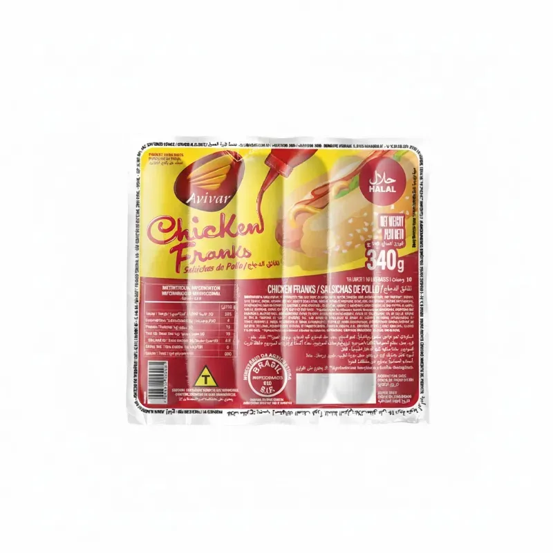 Se trata de un empaque de Chicken Franks (Salchichas de Pollo) de la marca Avivar, diseñado para el mercado internacional, incluyendo certificaciones específicas para diferentes regiones.