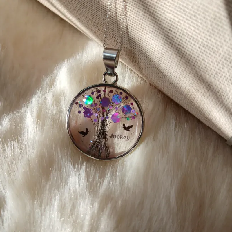 Aro de acero plateado, de 2.5 cm, con encapsulados de pelitos en forma de árbol, y herraje plateado de acero