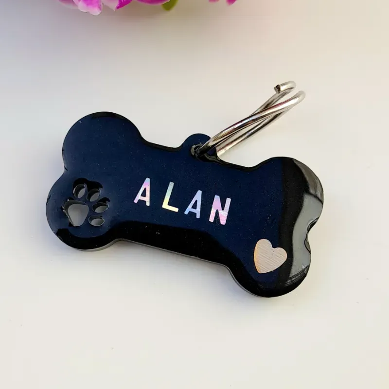 Consta de una pieza de resina en forma de hueso, huella, cabeza de gato, pescadito, de tamaño grande o pequeño según la raza, con nombre, dirección y teléfono