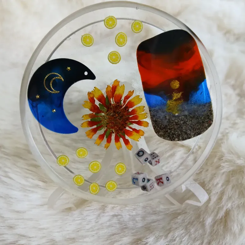 Pieza de resina epoxica, en forma de círculo, con una medida de 9 cm. Con el color y diseño que usted elija. Apoyado sobre una base de acrílico transparente.