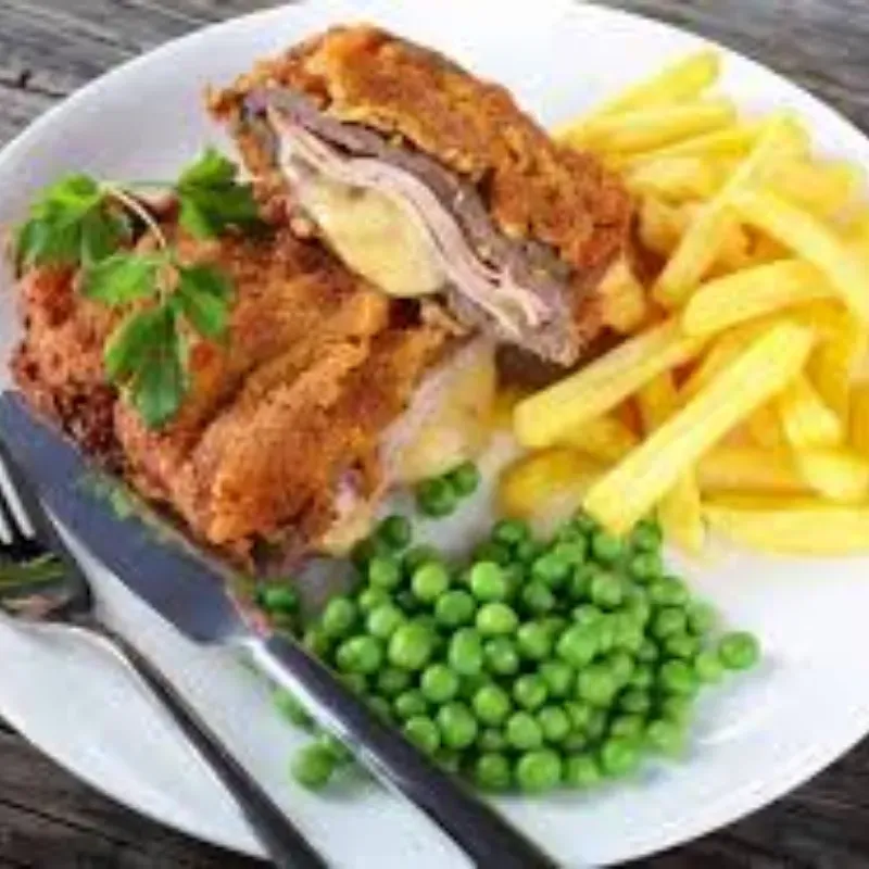 Carne de cerdo, Jamon Bravo, Queso Gouda, Aceite, Limón, Harina de Trigo, Pan Rallado Huevo, Ajo, Pimienta con Limón, Sal