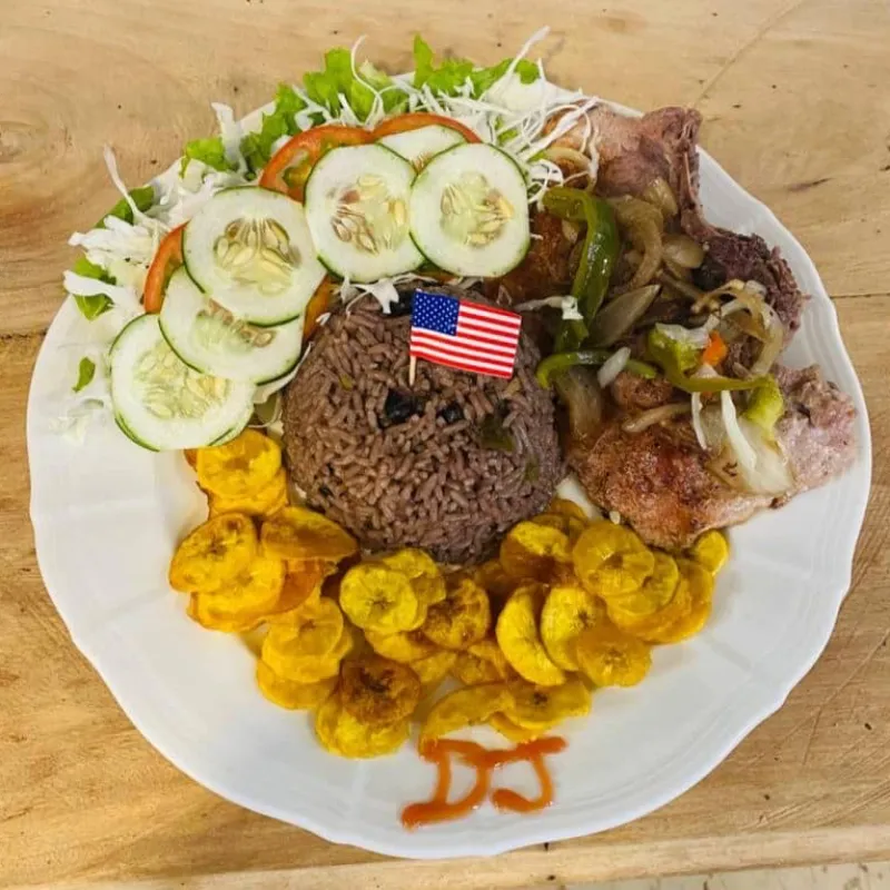 (Con congris) Chuletas de cerdo doradas a la plancha, servidas con congris y crujientes mariquitas de plátano.