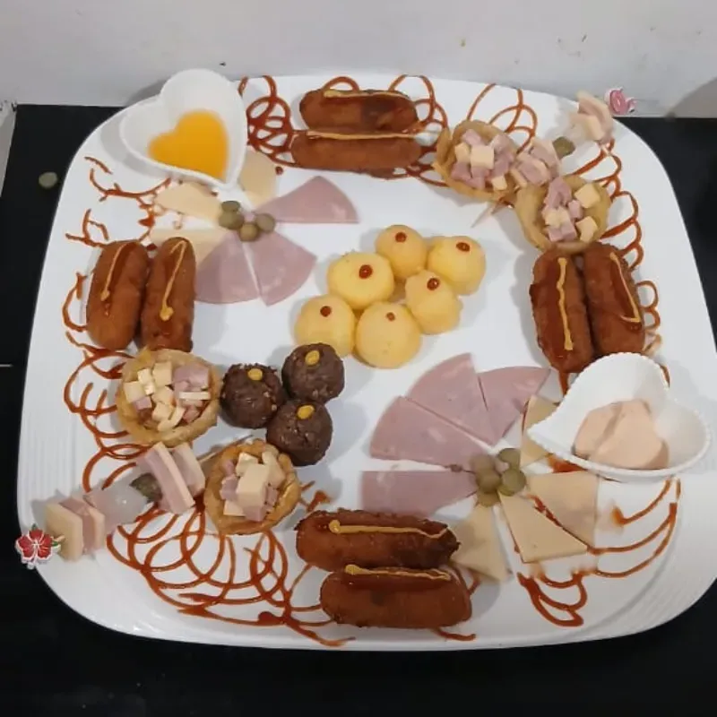 Tostones rellenos con jamón y queso, Bolitas de queso, Croquetas de Pollo Miel Mostaza, Salsa Rosa