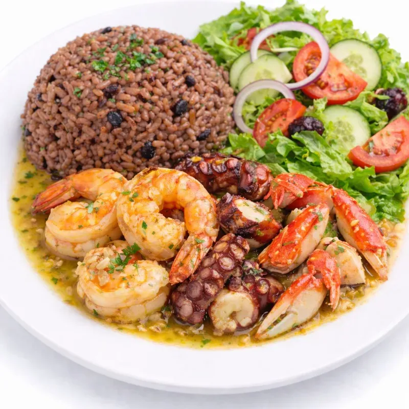 (Con Arroz Congris) Exquisita combinación de camarón, pulpo y cangrejo, salteados en mantequilla y ajo, resaltando el sabor de cada marisco por separado, servidos con arroz blanco y mariquitas de plátano.