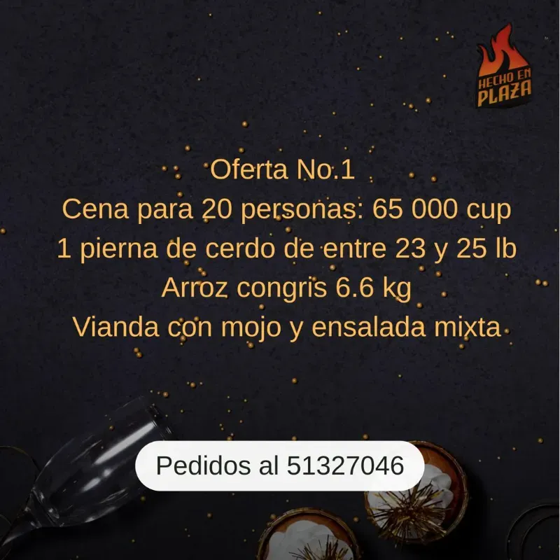 1 pierna de cerdo asada al carbón de entre 23 y 25 lb acompañada de 6.6 kg de arroz congrís, vianda con mojo y ensalada mixta