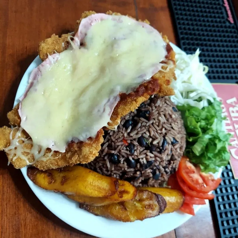 Filete de pescado empanado con jamón y gratinado con queso Gouda y salsa Nápoles, acompañado con arroz moro o blanco, ensalada mixta de vegetales y vianda.