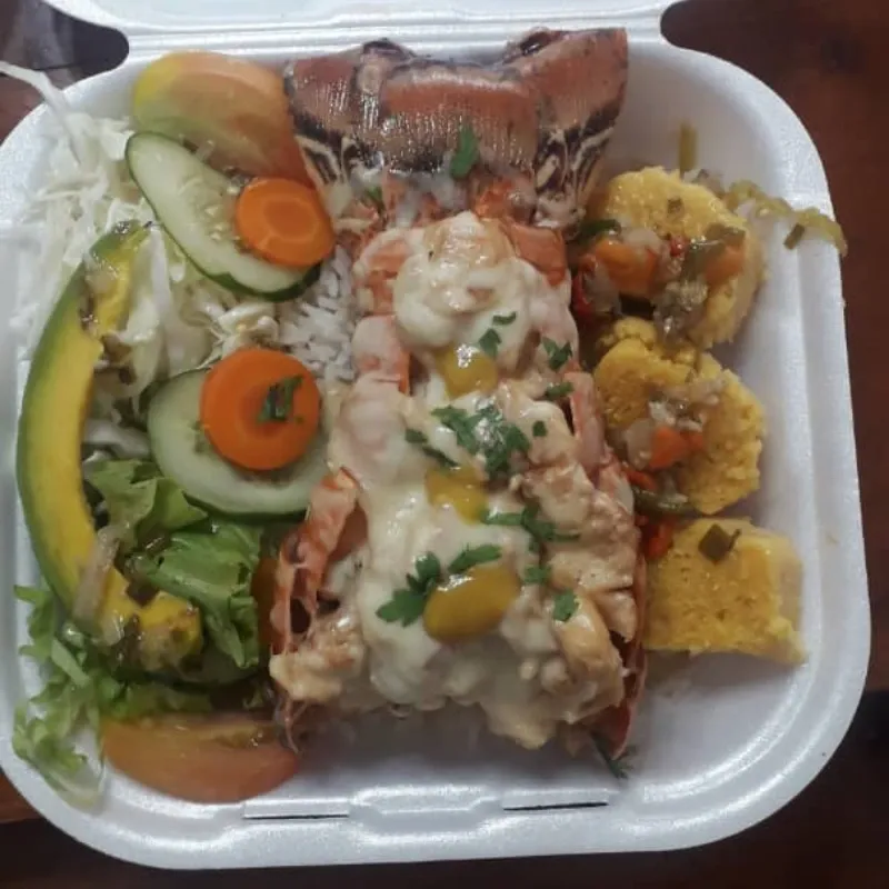 dados de langosta salteados; napados con salsa de media crema y mostaza, gratinada con queso gouda