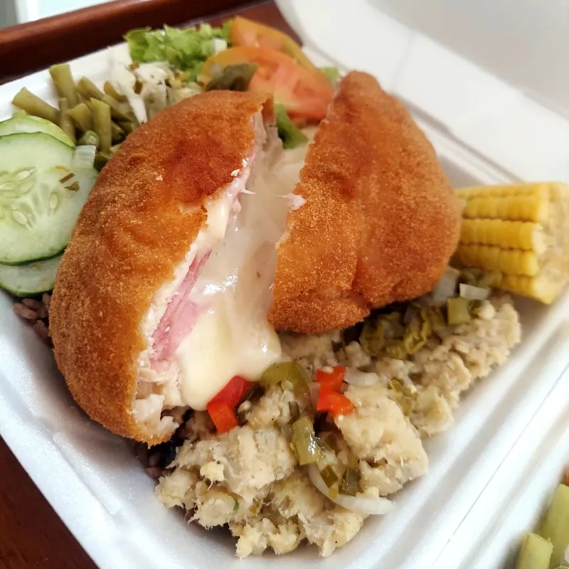 Filete de Pescado empanado con jamón vicky y queso gouda, acompañado con arroz moro o blanco, ensalada mixta de vegetales y vianda.