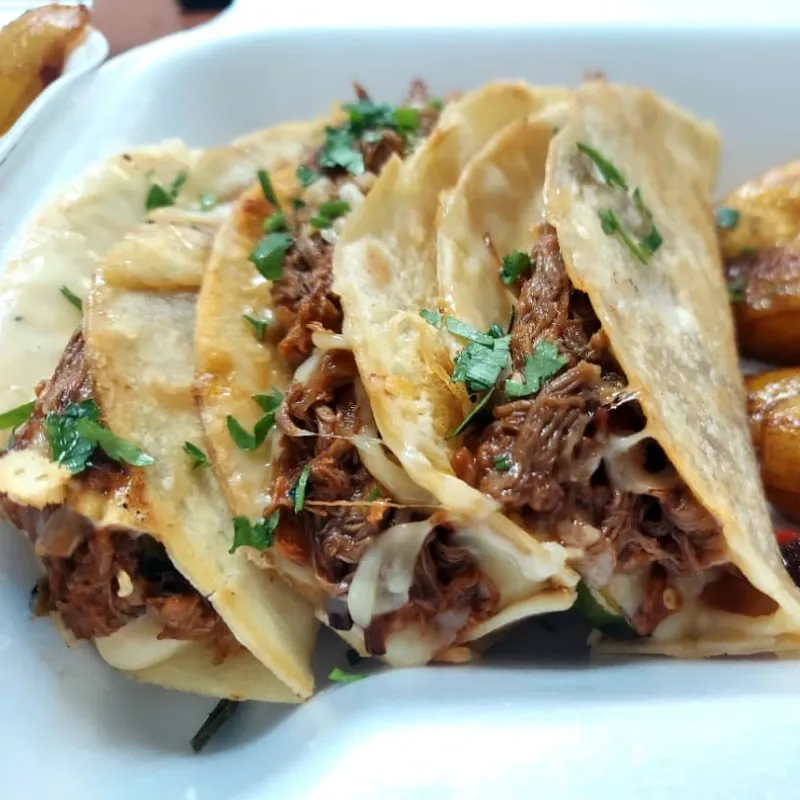 3 tortillas con ropa vieja de res + queso gouda + plátano maduro frito
