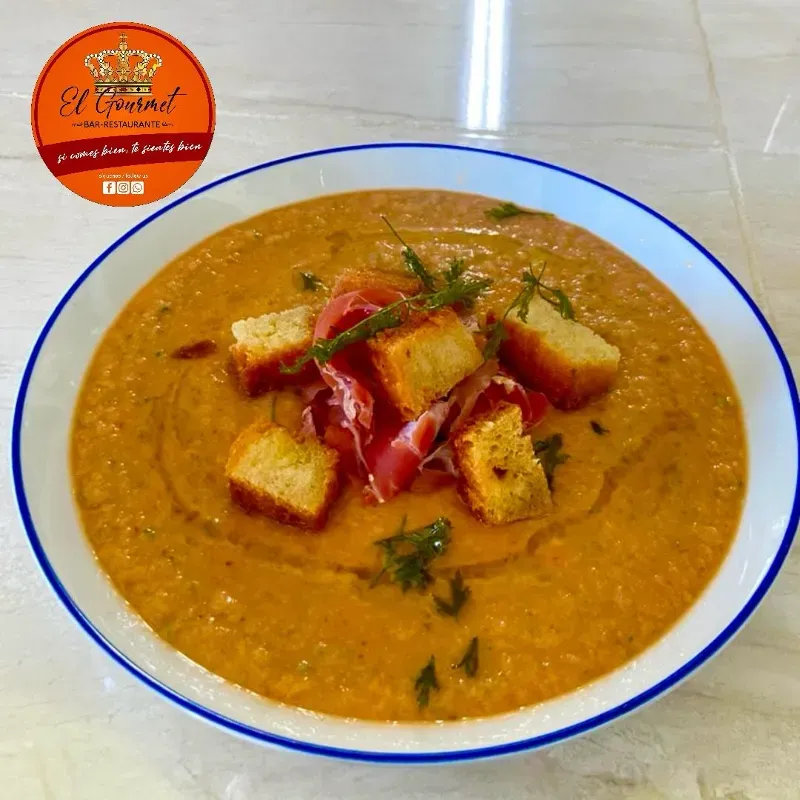 Delicioso salmorejo realizado con tomate y coronado con un crujiente de bacon. Ideal como entrante para el verano.