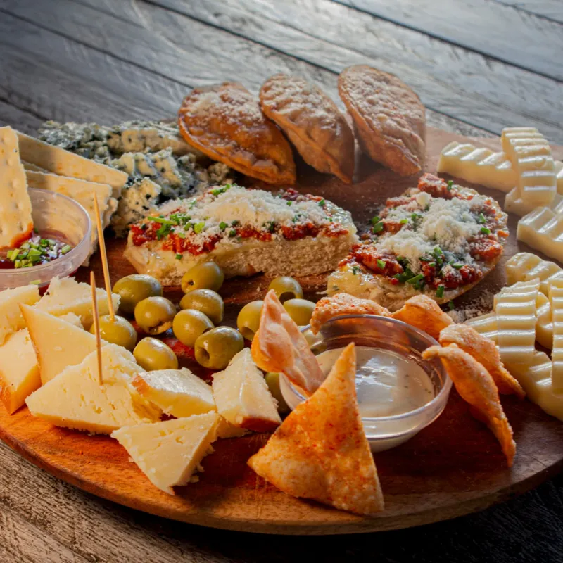 Una selección de quesos en los cuales está: Azul , Cabra , Gouda y parmesano , acompañado de aceitunas , nachos y empanadas