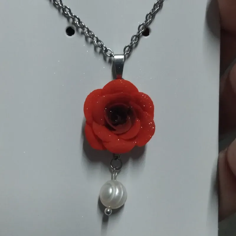 Una rosa roja moldeada a mano, acompañada de una perla natural de agua dulce que aporta luz y delicadeza ✨