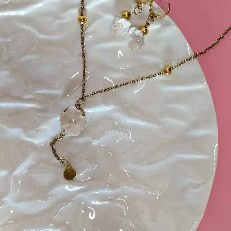 Flores hechas a mano combinadas con perlas que se deslizan suavemente, creando movimiento y luz.