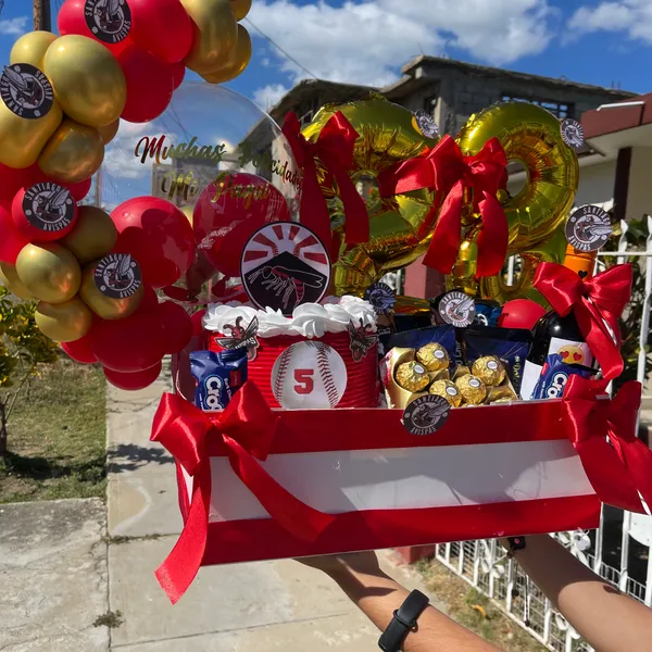 Bandeja personalizada + # metálicos de 16 pulgadas +decoracion de globos de látex +arreglo floral +globo metálico de corazón +1caja de jugo + pak de frutos secos + 15 confituras