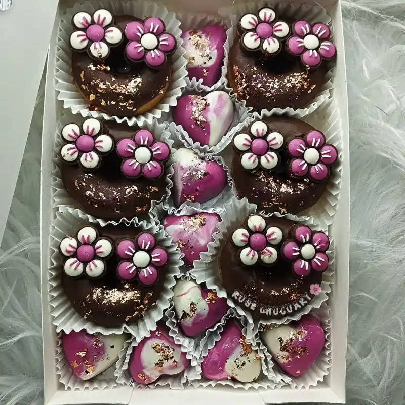 🍩🍫Caja de 6 minidonas saborizadas 😋 + 9 bombones rellenos.