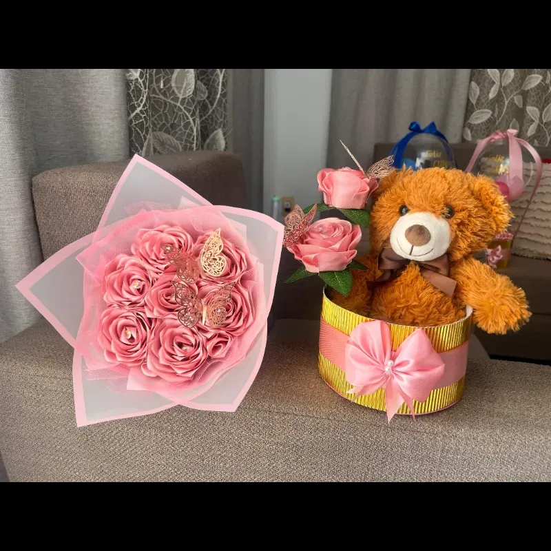 Caja de regalo con peluche y ramo de flores
