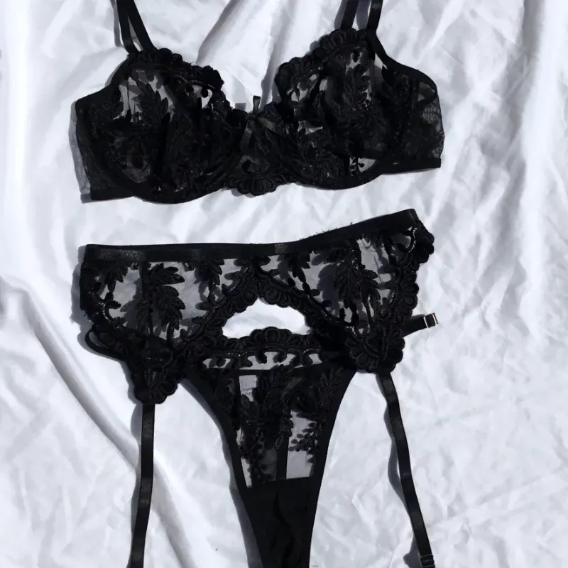Conjunto de encaje oscuro con liguero integrado, de líneas precisas y tensión contenida. Nyx es noche cerrada: lo que se insinúa más de lo que se muestra.
