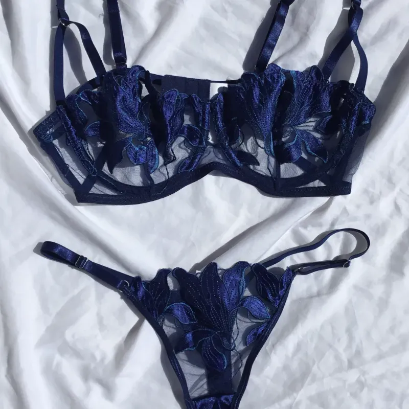 Encaje translúcido en tono marino, con estructura ligera que acompaña el cuerpo sin imponerse. Thalassa es profundidad y calma: una presencia que se desliza, como agua sobre la piel.