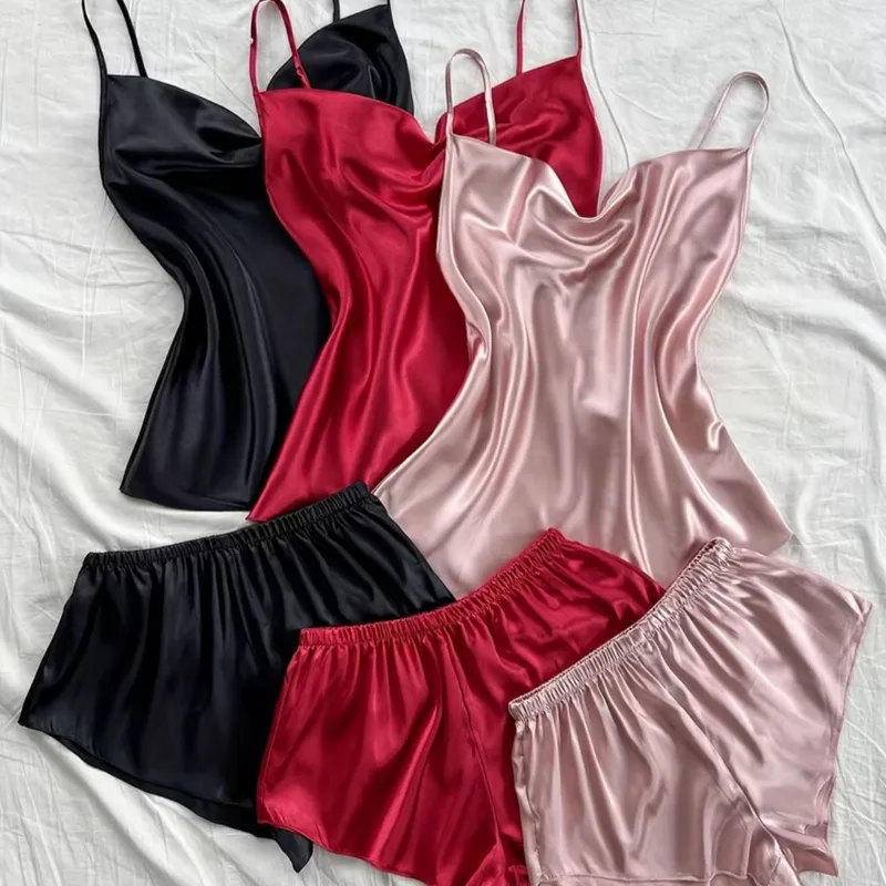Top con vuello falso y shorts para mujer. Conjunto sexy para dormir.