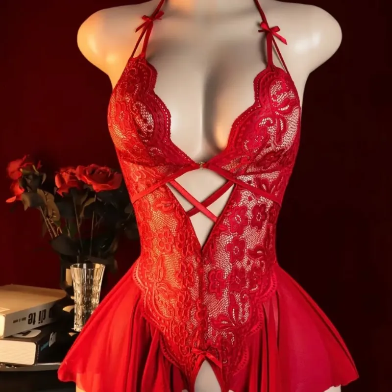 Body sin espalda rojo de encaje para mujer, con cuello hueco en contraste, que ofrece cobertura total sin relleno. Este mono ajustable se confecciona con tela elástica lavable a mano.