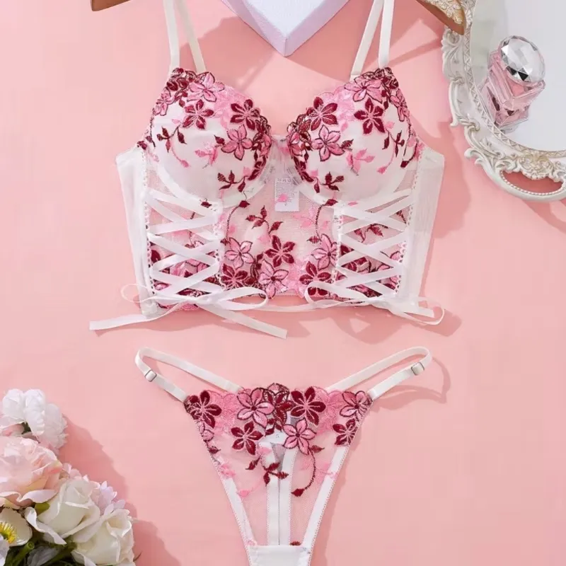 2 Piezas de ropa interior de encaje a juego y top con lazos laterales.