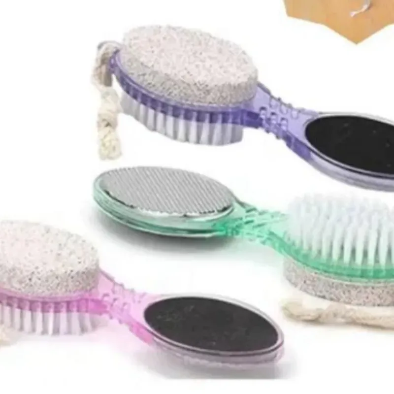 Práctico accesorio para el cuidado de los pies que combina tres funciones en un solo producto: cepillo de cerdas suaves para limpiar y exfoliar, piedra pómez para eliminar durezas y callos, y una lima metálica para alisar la piel. Mango ergonómico traslúcido con cordón para colgar. Disponible en colores pastel: rosa, morado y verde.