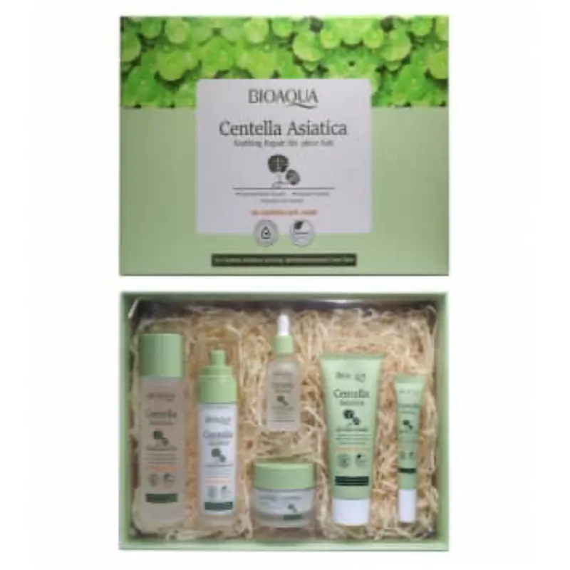 Este es un set de cuidado facial de Bioaqua Centella Asiatica, diseñado para calmar, reparar e hidratar la piel.