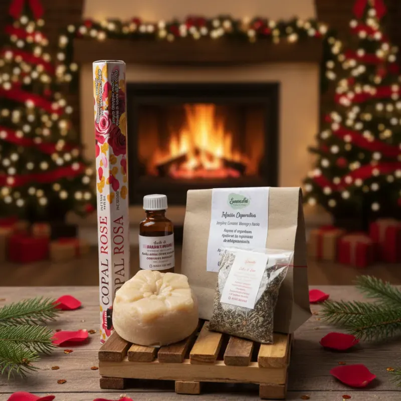 Perfecto para desconectar del estrés navideño y crear un spa en casa. Baño: Sales de Baño + Jabón de Glicerina de Manzanilla y Miel. Cuerpo: Aceite de Árnica y Menta. Momento Zen: Infusión Relajante e Inciensos.