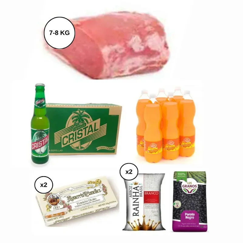 Lomo Deshuesado (5~6 kg) 6 Refresco Ciego Montero 1.5lt 2 Turrones 2 Arroz Rainha 1 Frijol Negro 24 Cerveza Cristal Botella