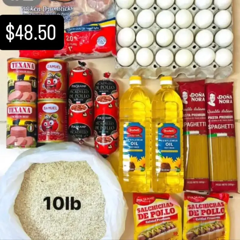 - 1 paquete pollo 4.4 lbs - 1 fili huevos - 2 latas spam o carne enlatada según la disponibilidad - 2 latas puré - 2 picadillos de pollo - 2 pomos aceite - 2 Spaguetis - 10 lbs arroz - 2 sopas instantáneas