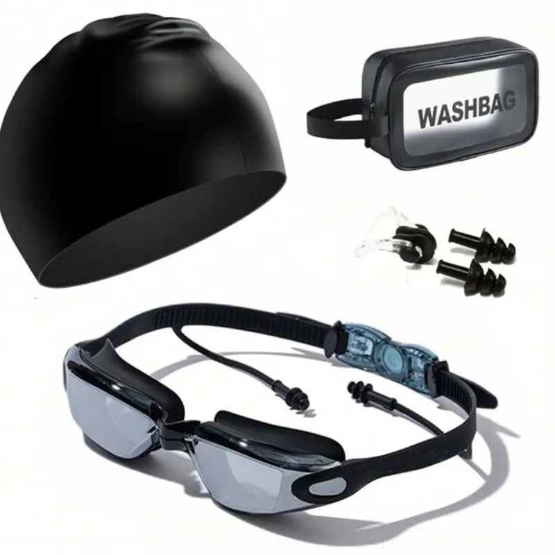 Set de gafas de natación para adultos con electrochapado, gafas de natación antivaho y resistentes al agua con recubrimiento antifugas y anti-UV, diseño integrado con tapones para los oídos para protección auditiva al nadar en la piscina o en la playa, adecuado para entrenamiento, artículos esenciales de playa, accesorios de playa, flotador de piscina