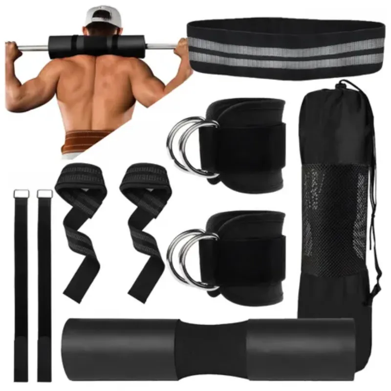 CONJUNTO de accesorios de fitness para sentadillas y levantamiento de pesas, que incluye una almohadilla de espuma para barra, correas de levantamiento, correas de tobillo y una banda de resistencia para la cadera.