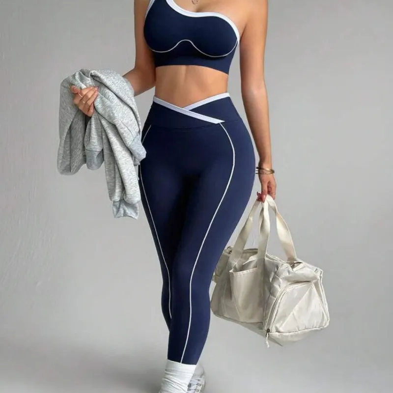 Conjunto de Top sin costuras de un solo hombro y Pantalones 3/4 con cintura cruzada, Conjunto deportivo, de yoga, running y fitness suave y que se ajusta al Body para mujeres