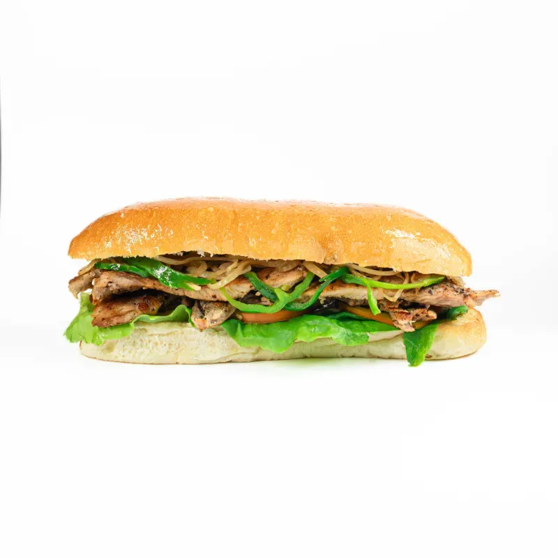 Baguette, bisteces de cerdo vegetales y aderezos