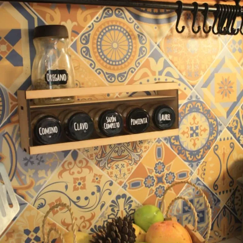 Repisa de madera de 2 pisos.Facilita el acceso a los Potes de condimentos. Viene con 5 frascos pequeños y etiquetas de cocina.