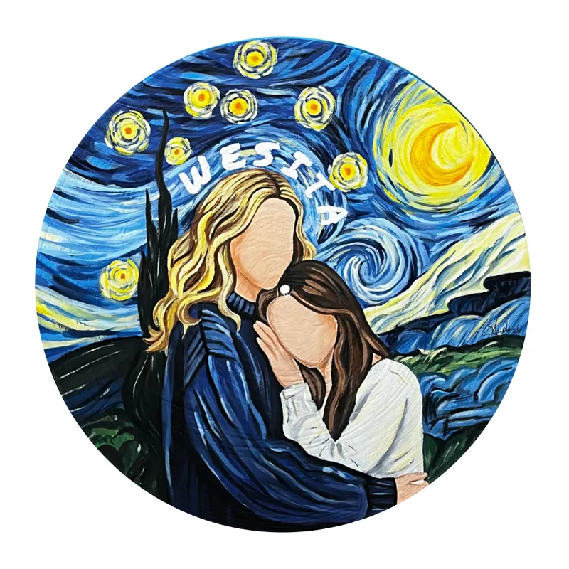 Vinilo pintado a mano con imagen completamente personalizada por el cliente. Fondo inspirado en la noche estrellada de Van Gogh.