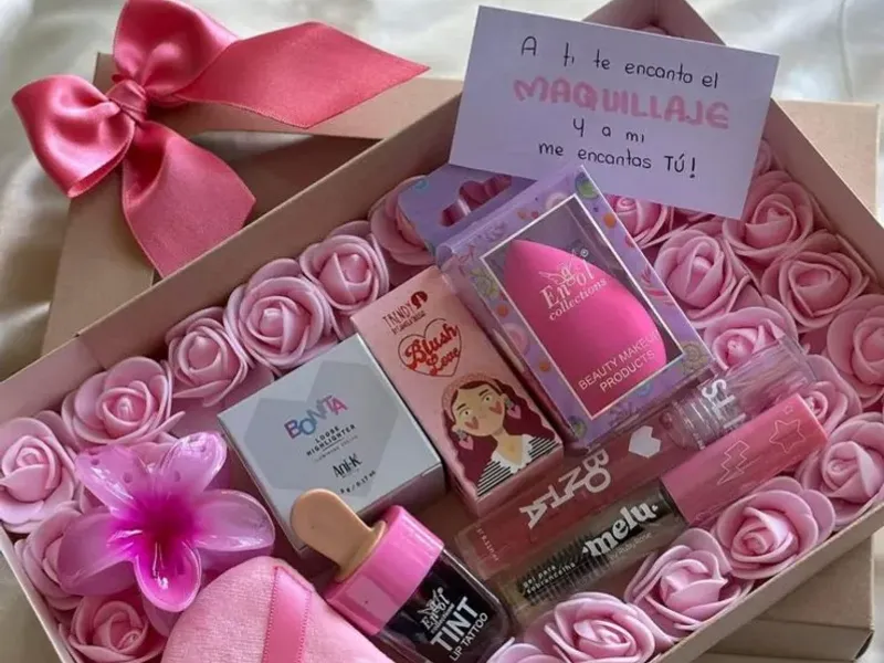 Dentro de una mini caja de madera rústica, cuidadosamente decorada con papel crepé, se reúnen accesorios y esenciales de belleza que transforman cada rutina en un ritual especial: