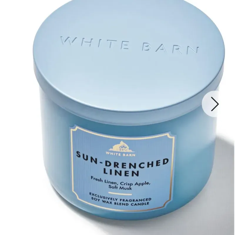 Una bocanada de frescura y serenidad. Sun-Drenched Linen es una fragancia limpia y reconfortante que combina la suavidad del lino recién lavado con la vivacidad de la manzana crujiente y un toque de almizcle delicado. - Vela de mezcla de cera de soya (White Barn): Su diseño en azul claro con tapa metálica aporta elegancia discreta a cualquier espacio. Ideal para crear ambientes luminosos, ordenados y tranquilos. Perfecta para quienes aman la sensación de hogar limpio, aireado y lleno de calma. 🫧🩵🕯️